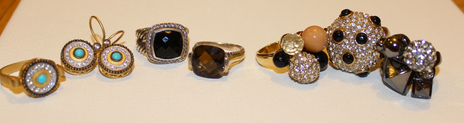 Left to right: A set that I received as a gift (from Turkey), David Yurman (http://www.davidyurman.com/shoponline/suite.aspx?itemid=-20PC&folderid=/women/rings), Ostbye (http://www.ostbye.com/pr/rc08f05sq/8/293/5226) (I got this ring from my Aunt and Uncle’s Jewelry store, Roland’s in Tell City, IN. I love it!) J.Crew, J.Crew, J.Crew