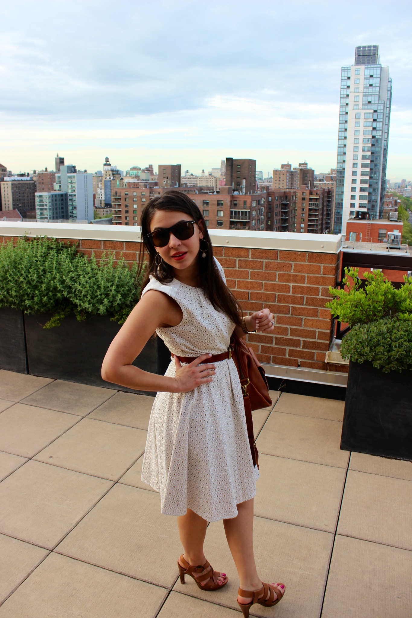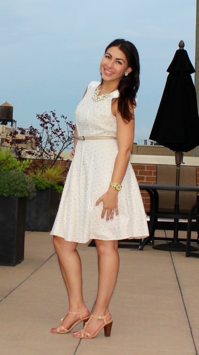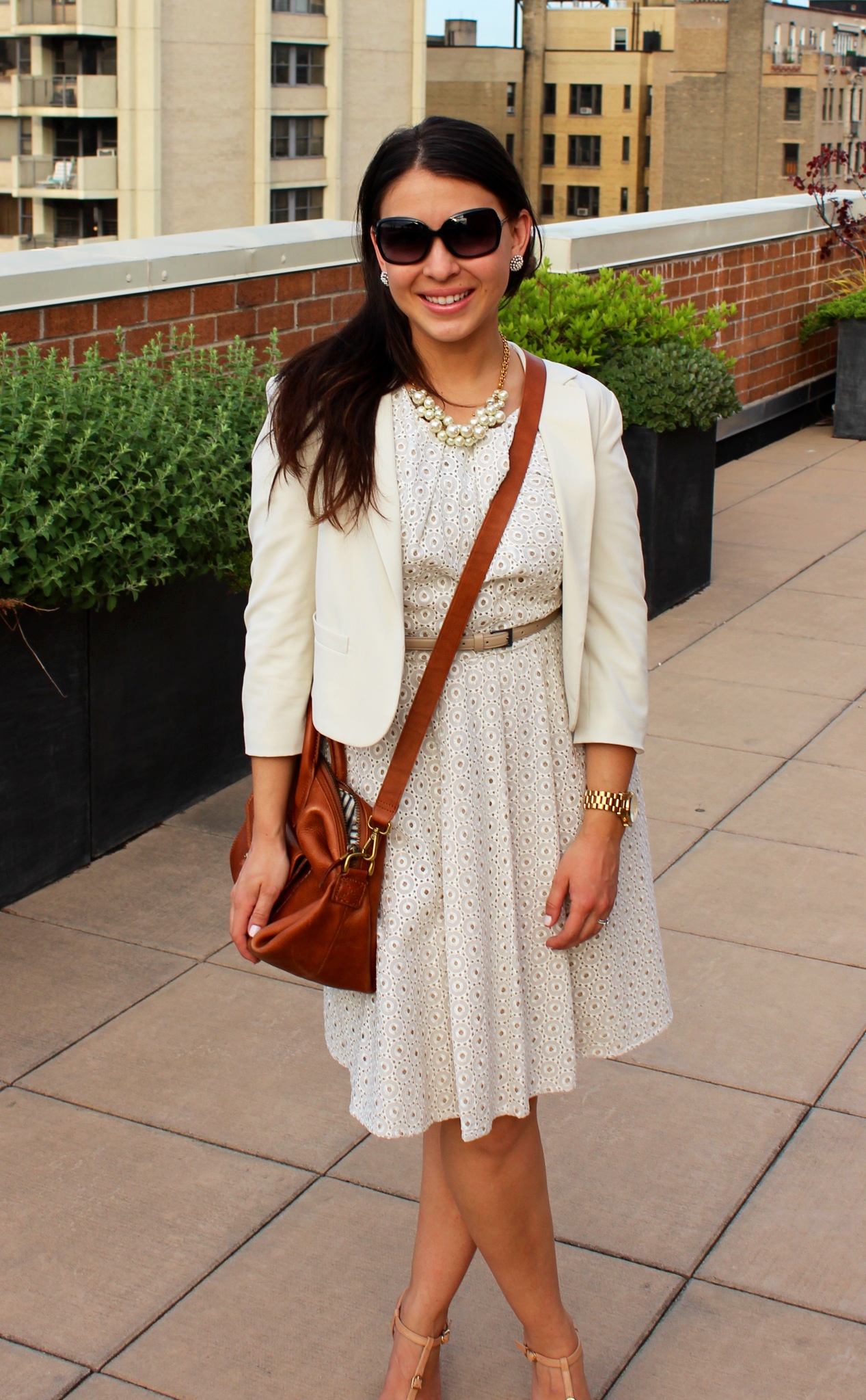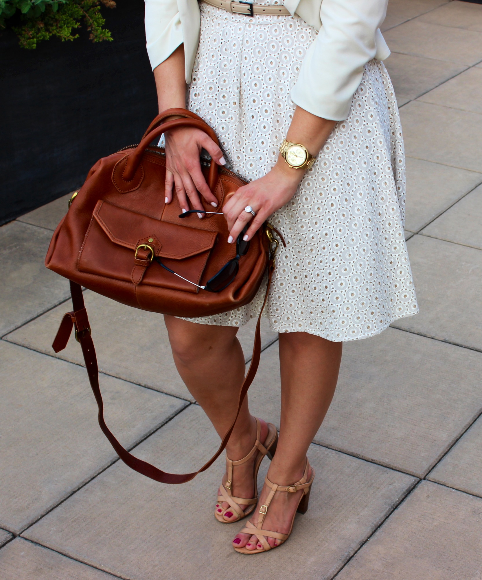Dress: Vince Camuto (with tan belt), Blazer: Frenchi (Nordstrom), Necklace: J.Crew, Earrings: (Hoops) Anthropologie, (Studs) Nordstrom, Shoes: (Dark Brown) Nine West, (Tan) J.Crew, Purse: Madewell (a lovely gift that I adore), Sunglasses: Marc Jacobs, Dark Tan belt: J.Crew
