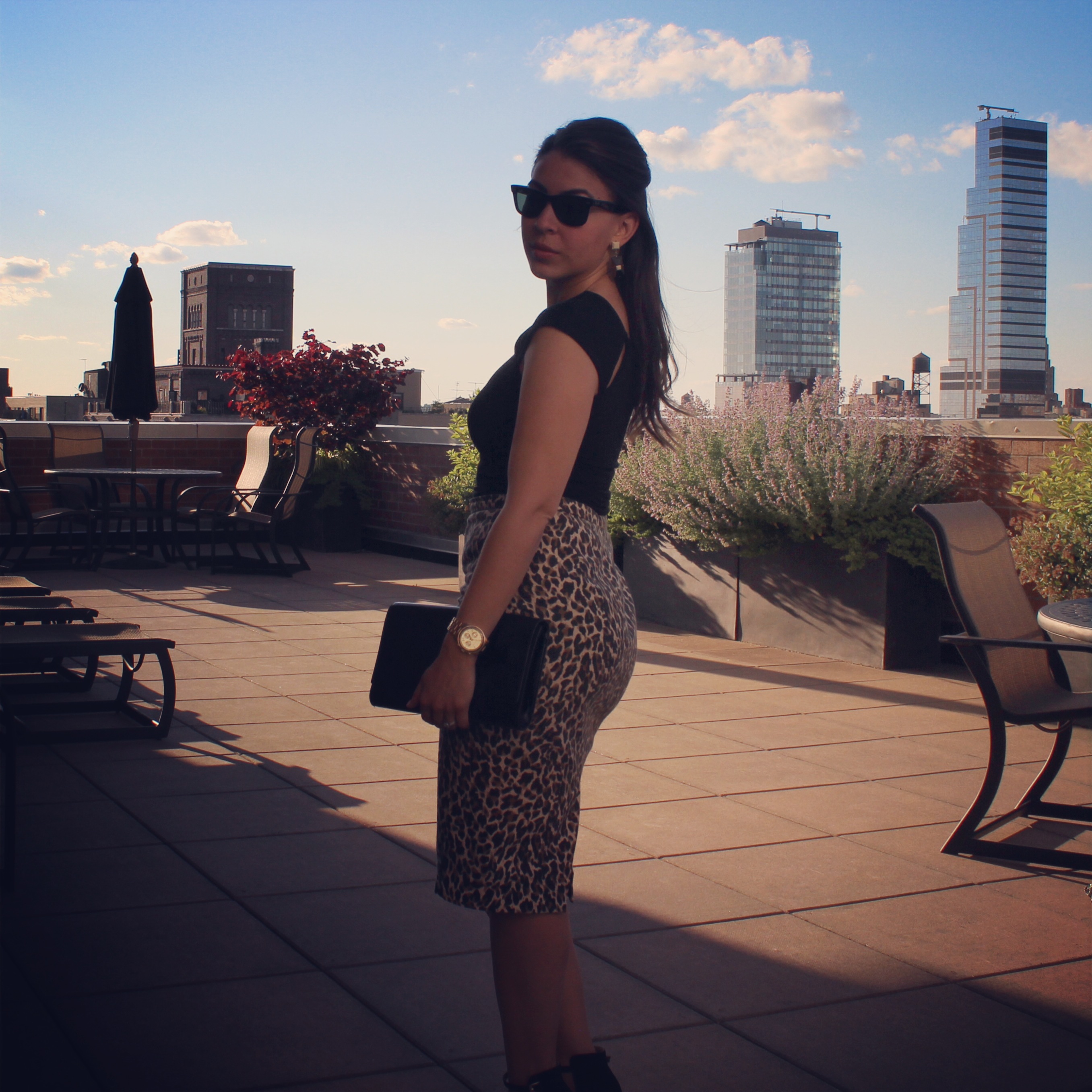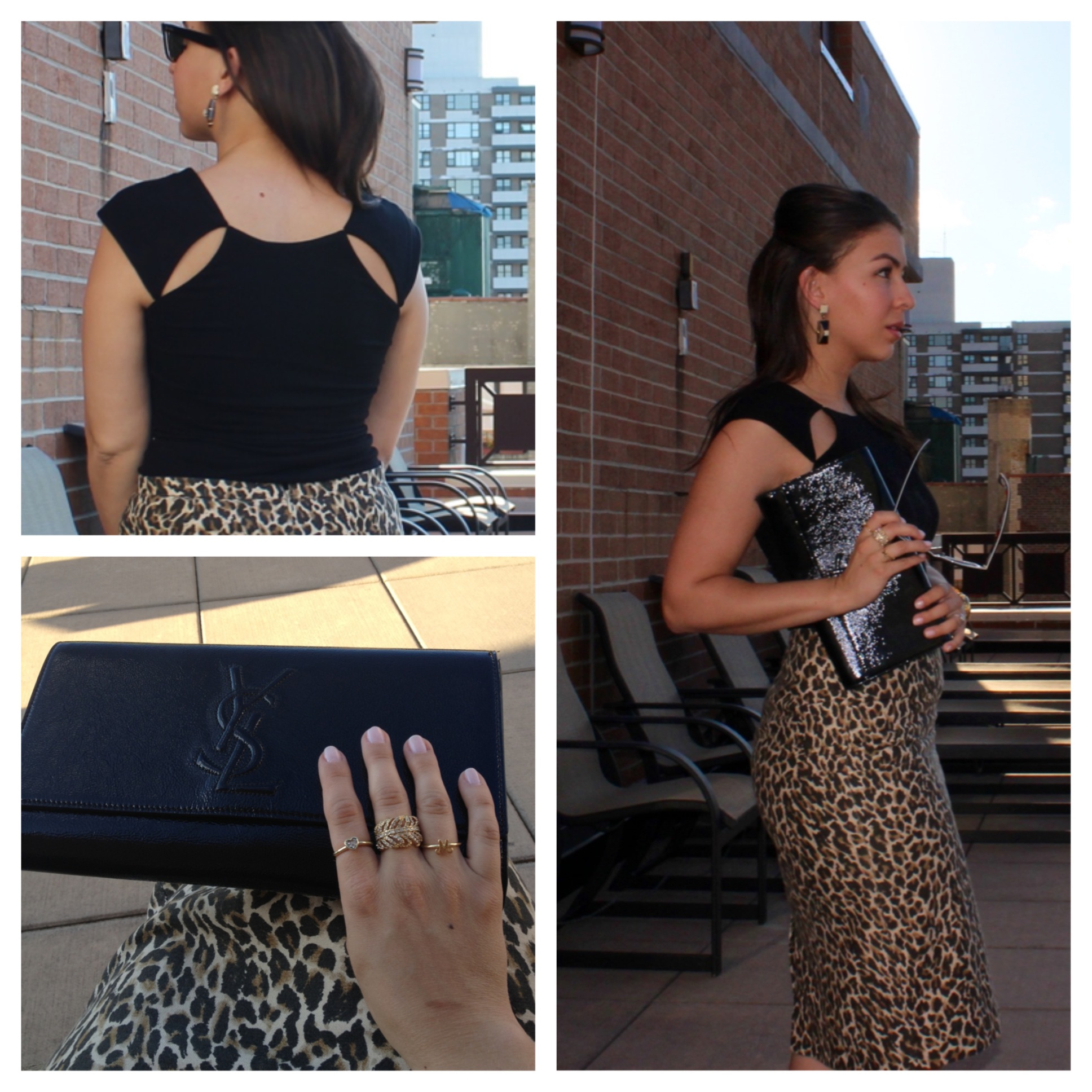 Skirt: J.Crew (old), Shoes: Zara, Shirt: Bailey44, Jewelry: Ring (Middle) J.Crew, Other Rings: Ariella Collection, Earrings: Marc Jacobs, Clutch: YSL, Sunglasses: Ray-Ban